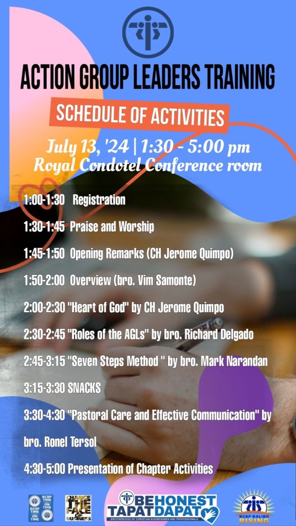 The BCBP Kalibo Chapter’s Echo AGL Training, facilitated by the Teaching Ministry under the Formation Directorate led by Bro. Vim Samonte, proved to be a valuable learning experience for the participating AGLs and Potential Leaders. By supplying them with information that would deepen their understanding of their roles, the BCBP’s core principles, and effective communication skills, the training has prepared them to better serve BCBP Kalibo and its members.